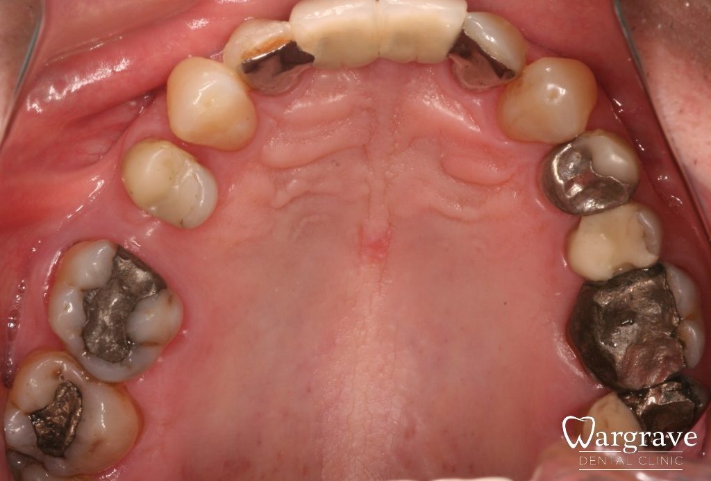This patient wished to protect all his large posterior fillings. 10 new crowns were provided on the premolars and molars, leaving all his front teeth as they were.