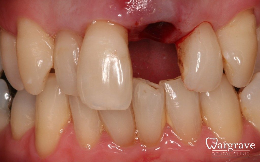 This gentleman suffered from advanced gum disease and had recurrent abscesses with his central incisor. The tooth was extracted and immediately splinted back into position serving as a temporary bridge but using his own tooth!